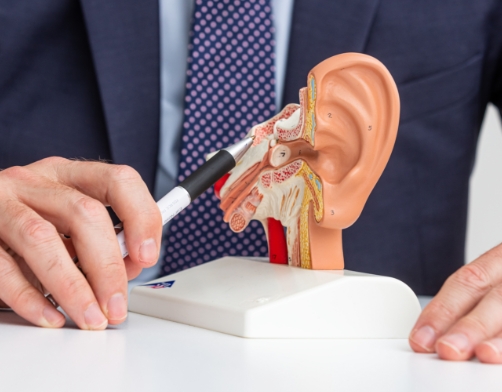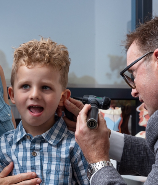 Glue ear often doesn’t cause many symptoms. Most often it causes nothing other than a mild to moderate hearing loss. You can get an idea of the sort of hearing loss most sufferers have by sticking your fingers in your ears. The effects of this hearing loss may however be profound. Due to the young age of the population, it affects the presence of glue ear is often not noted until the child fails a school hearing test or has a delay in their speech. Glue ear is the commonest cause of significant speech delay in toddlers. The lack of hearing and speech may cause other problems in young children some of whom have difficulty concentrating and poor behaviour, there is also some evidence that some children with glue ear have poorer balance and may be regarded as “clumsy”. Occasional episodes of mild, short lived ear pain are not uncommon but are not associated with the severe pain and fevers seen with acute ear infections. Children may get severe ear pain when flying. Examination of the ears with a special torch, an otoscope, shows dull grey looking eardrums which may look sucked in or retracted. They do not move with changes in air pressure. The nose may be blocked if large adenoids are present.