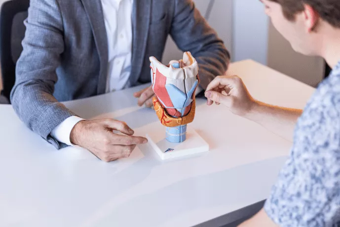 At My ENT Specialist, A/Prof McGuinness will take a history and perform a thorough physical examination. Most often we use a Nasal Endoscopy to see inside the larynx and make a diagnosis. Nasal Endoscopy is a procedure performed in the office in which we use a thin, flexible tube with a camera and light source at its end to look inside the throat and to take pictures. It only takes a few minutes and is entirely painless. Videostrobolaryngoscopy is a specialized technique performed at the same time as nasal endoscopy. It is useful to show us how invasive the tumour may be and which types of treatment would be best. If a cancer is suspected then a biopsy will generally be required. This is usually performed as a day procedure under general anaesthetic and is called Microlaryngoscopy and Biopsy. It is very safe and generally painless. CT, MRI and PET scans may be required to determine the location, stage and spread of the cancer.